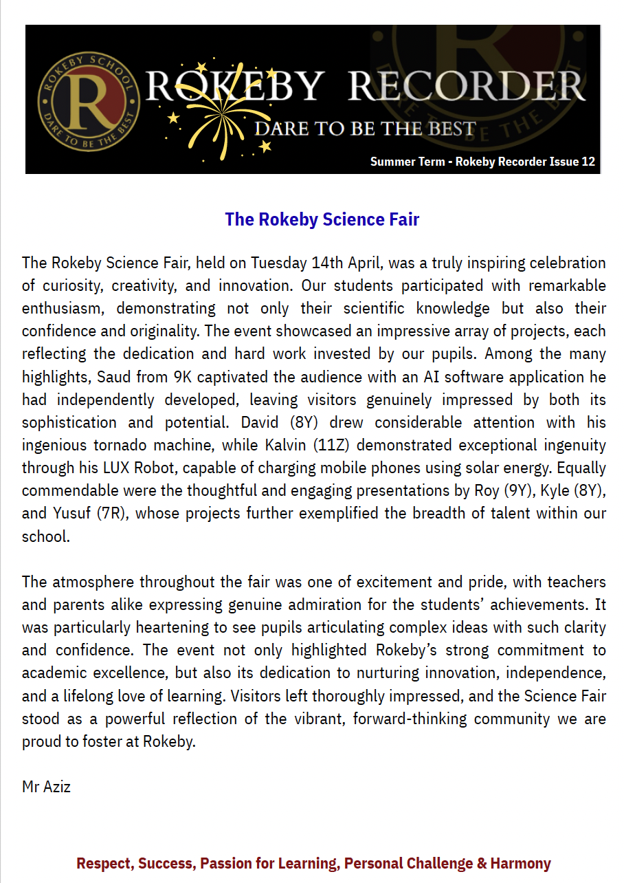 At Rokeby School in Newham, we are proud to publish our in-house newsletter, The Rokeby Recorder. Released regularly, it provides students, parents, carers, and the wider community with a snapshot of school life and achievements.